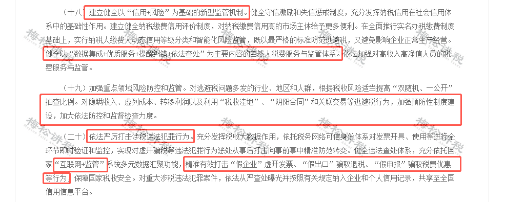 (3)“信用+風(fēng)險”監(jiān)管新體系。高收入人員注意了!健全以“數(shù)據(jù)集成+優(yōu)質(zhì)服務(wù)+提醒糾錯+依法查處”為主要內(nèi)容的自然人稅費服務(wù)與監(jiān)管體系。依法加強(qiáng)對高收入高凈值人員的稅費服務(wù)與監(jiān)管。