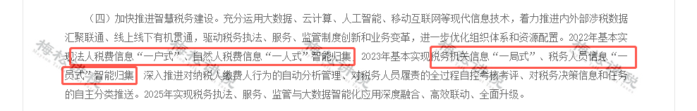 2022年基本實現(xiàn)法人稅費信息“一戶式”、自然人稅費信息“一人式”智能歸集,2023年基本實現(xiàn)稅務(wù)機(jī)關(guān)信息“一局式”、稅務(wù)人員信息“一員式”智能歸集,深入推進(jìn)對納稅人繳費人行為的自動分析管理、對稅務(wù)人員履責(zé)的全過程自控考核考評、對稅務(wù)決策信息和任務(wù)的自主分類推送。