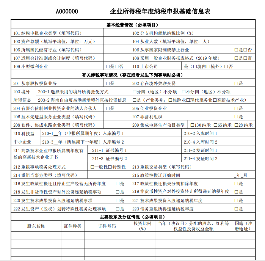 A000000《企業(yè)所得稅年度納稅申報(bào)基礎(chǔ)信息表》中:基本經(jīng)營情況為小微企業(yè)必填項(xiàng)目,“有關(guān)涉稅事項(xiàng)情況”為選填項(xiàng)目有關(guān)涉稅事項(xiàng)情況發(fā)生時(shí)才填報(bào),主要股東及分紅情況為免填項(xiàng)目。