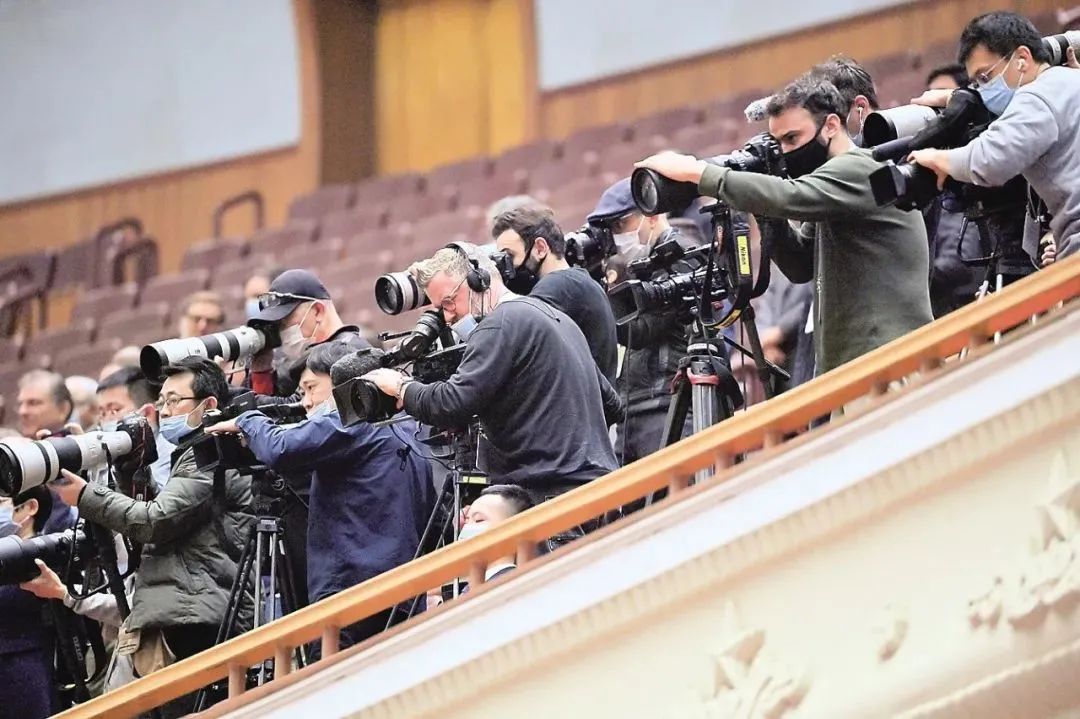 圖為中外記者在全國兩會上采訪。(圖片來源:新華社)