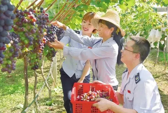 圖為國家稅務總局鳳翔縣稅務局干部來到當?shù)剞r業(yè)產業(yè)園,宣傳支持脫貧攻堅和農業(yè)發(fā)展的稅收政策,并與果農一起采摘葡萄,分享豐收的喜悅。