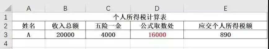 批量計算怎么辦?別發(fā)愁,我們有excel快捷公式奉上,還是剛才的例子,用A個人收入20000元,再減去五險一金4000元,求得16000元,填寫在表格D3處: